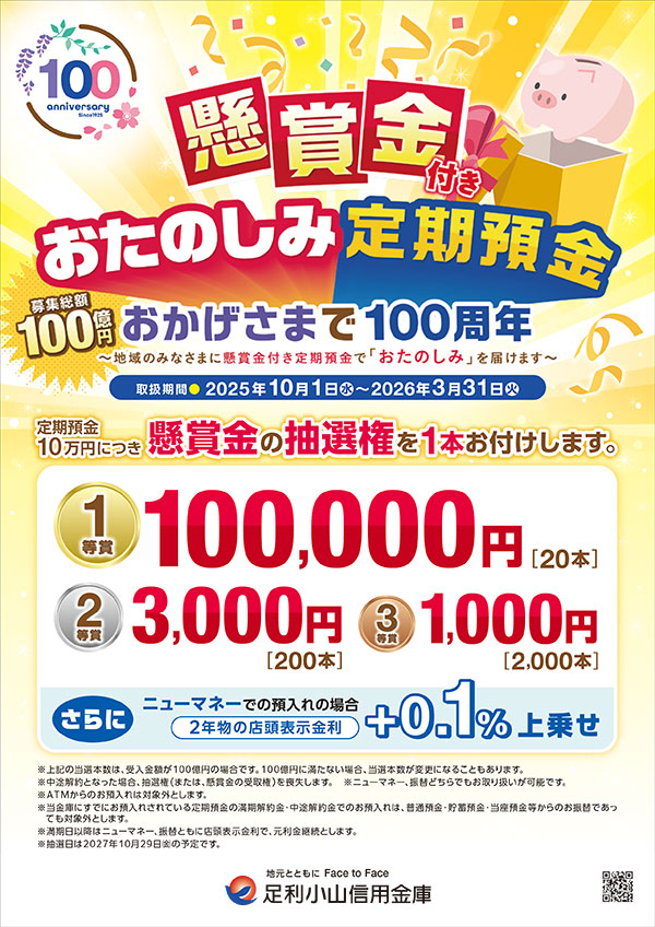 預入限度額 | 一口当たり 10万円以上500万円以内(万円単位) ※一人当たりの預入限度額は設けません。 ※万円単位で預入れは可能ですが、10万円未満の部分には抽選権は付与されません。 |