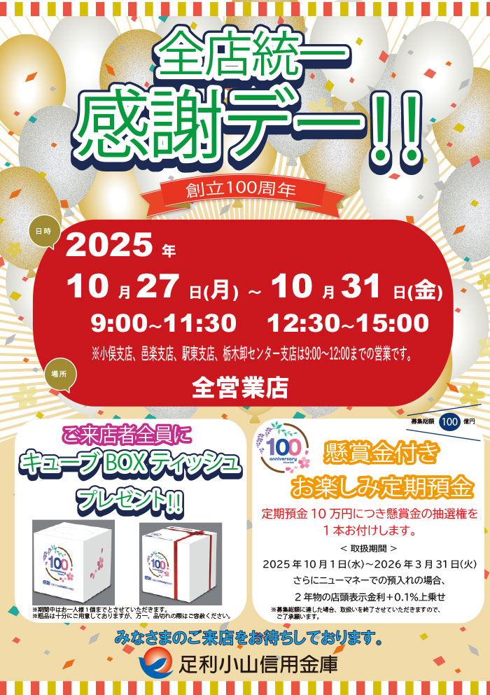足利小山信用金庫は2025年10月30日(木)をもちまして創立100周年を迎えます。これもひとえに、お客さまをはじめ関係各位の温かいご支援の賜物と心より深く感謝申し上げます。